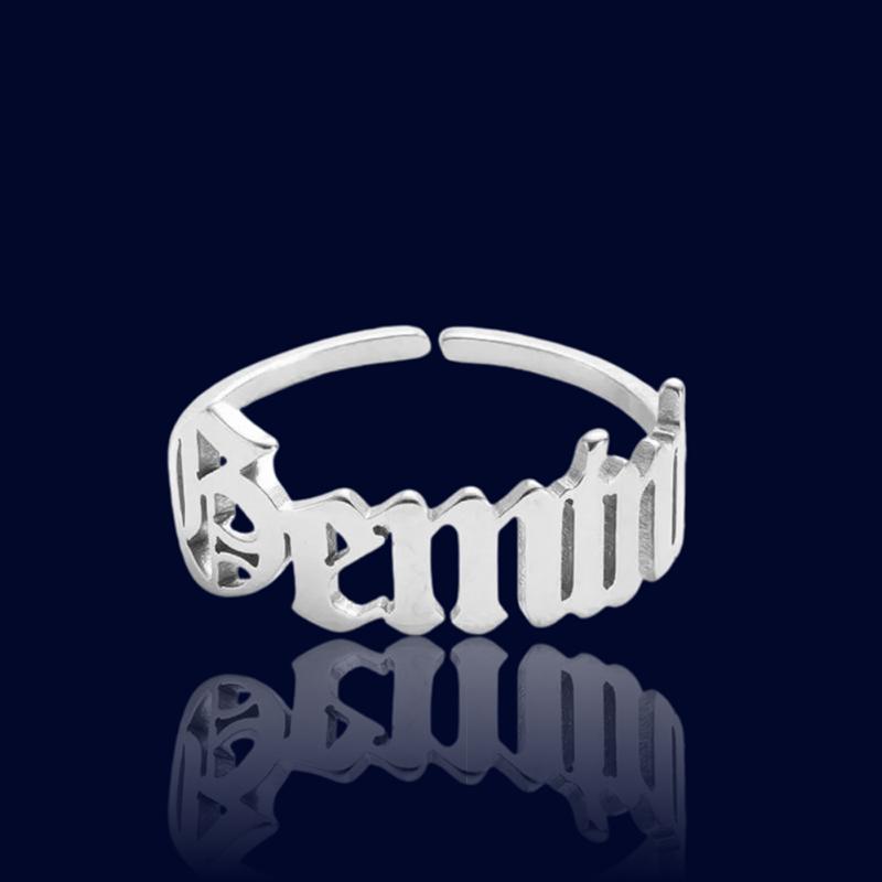 - Design : Anneau ajustable avec le nom du signe en écriture gothique manuscrite comme élément central.