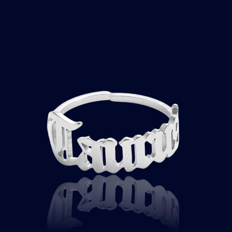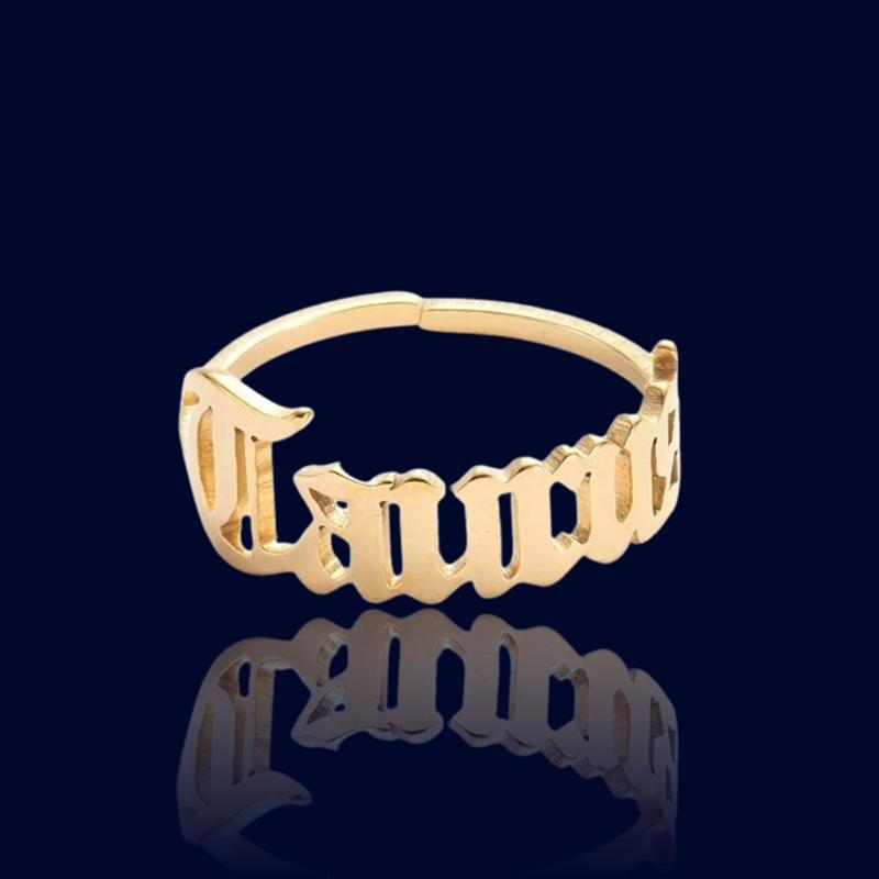 - Design : Anneau ajustable avec le nom du signe en écriture gothique manuscrite comme élément central.