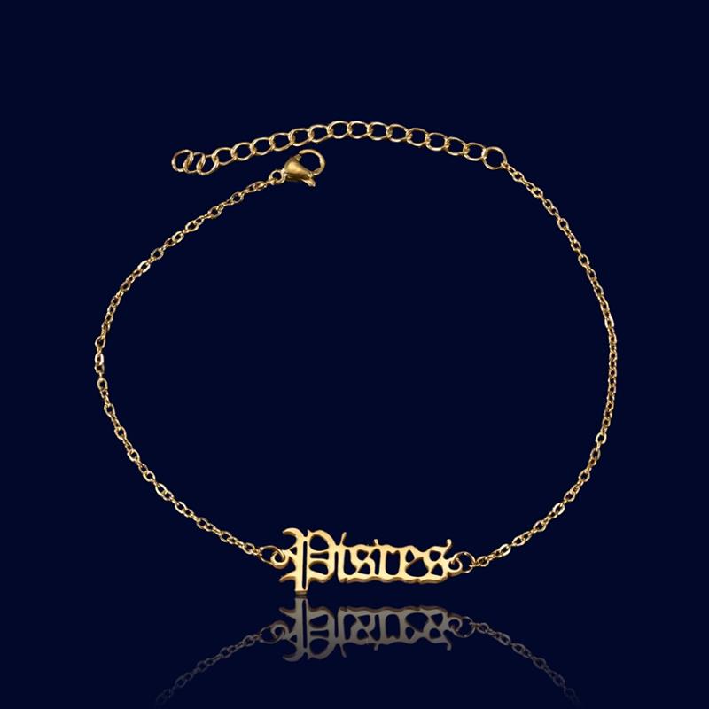 - Design : Chaîne de cheville avec le nom du signe écrit en lettres intégrées.