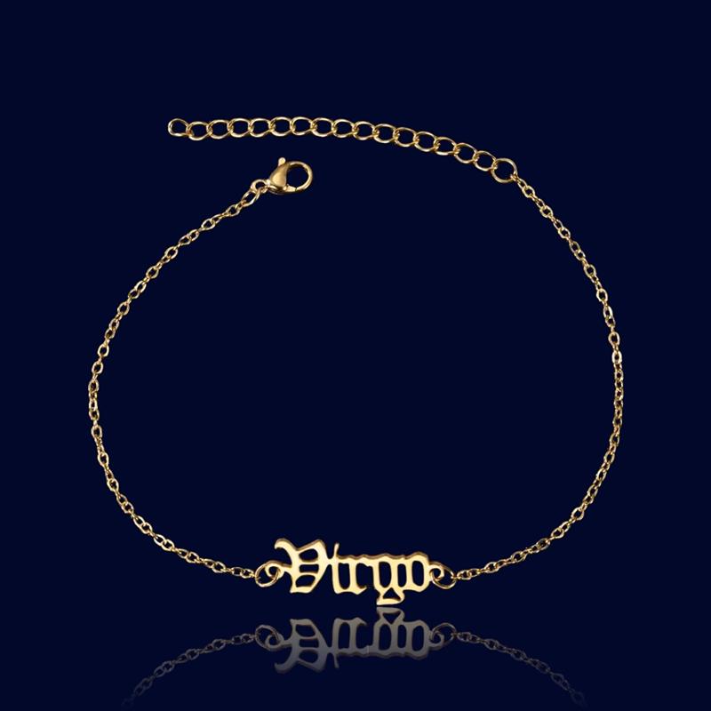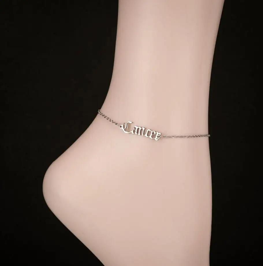 - Design : Chaîne de cheville avec le nom du signe écrit en lettres intégrées.
