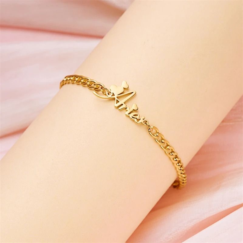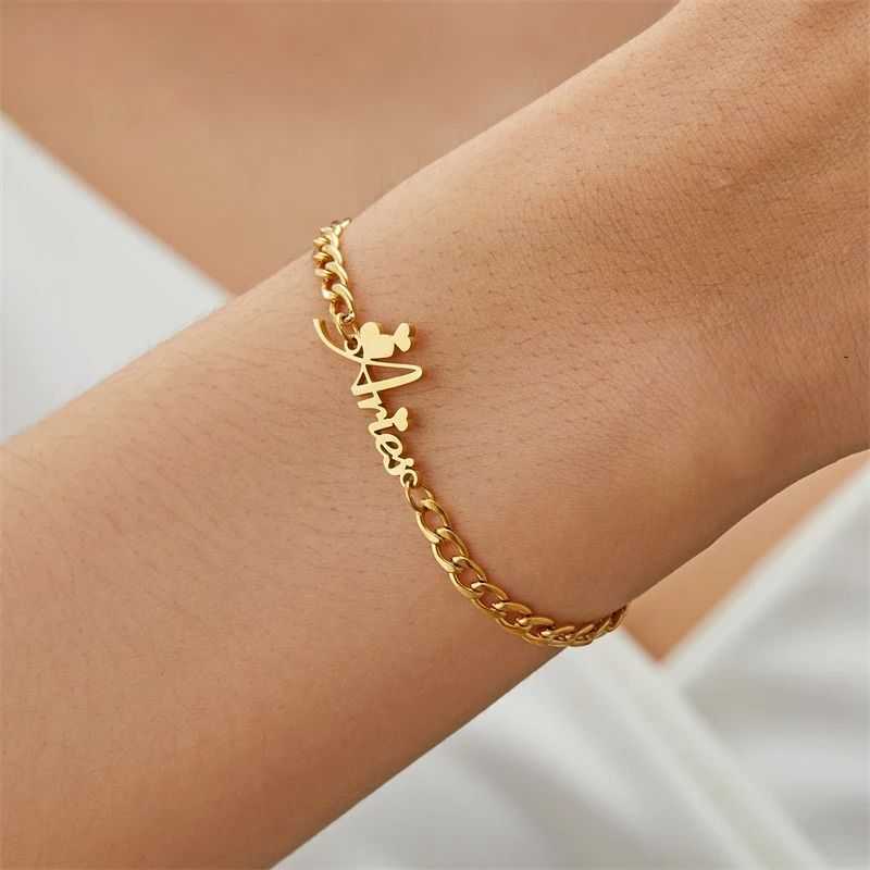 Le bracelet Eros appartient à une collection qui sublime la féminité par l'éclat chaleureux et intemporel de l'or. La finition dorée qui illumine la chaînette et l'écriture manuscrite de votre signe est obtenue grâce à un traitement de surface méticuleux sur une base d'acier inoxydable de haute qualité. Il est essentiel de préciser que ce choix garantit à la fois l'aspect précieux et lumineux de l'or et une excellente résistance au quotidien. Ce n'est donc pas de l'or massif, mais une alliance moderne entre beauté et durabilité, conçue pour que votre bijou conserve son éclat solaire jour après jour. Cette teinte or, symbole de lumière et de valeur, s'harmonise parfaitement avec l'énergie ardente du Bélier, ajoutant une touche de luxe raffiné à votre poignet.