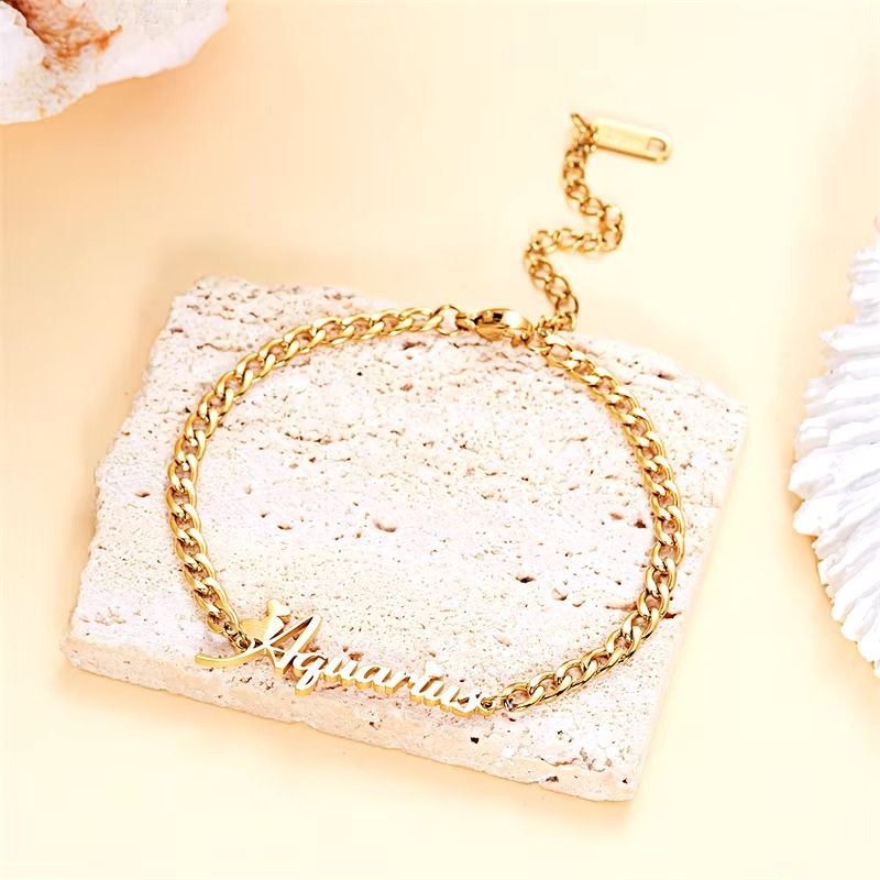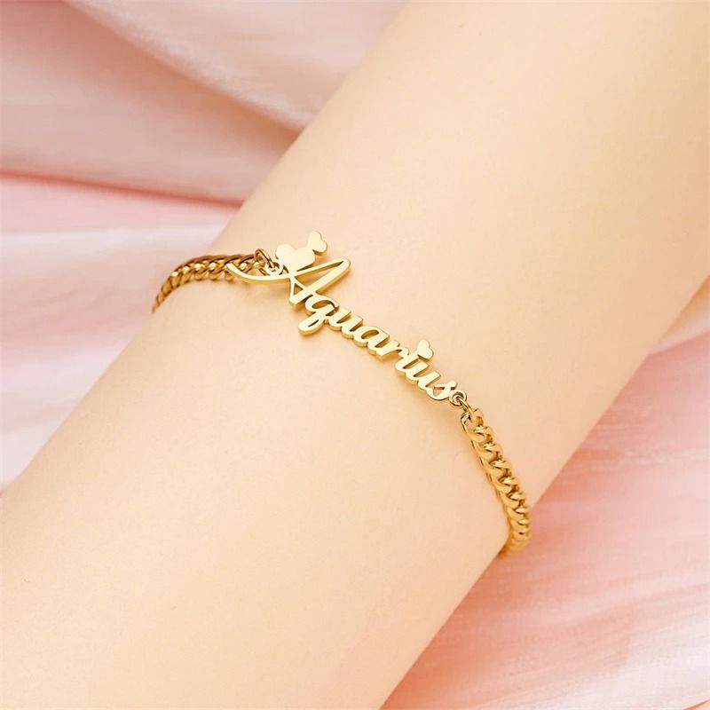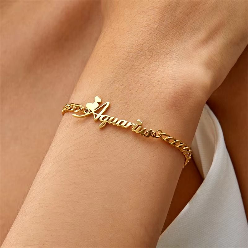 Affirmez votre esprit novateur avec le bracelet Eros, une création originale et personnalisée signée Aurea Astrae, dédiée à la femme Verseau. Ce bijou au design unique et moderne transforme votre signe astrologique en une signature calligraphique avant-gardiste. Le nom "Verseau" est rendu avec une écriture manuscrite fluide et aérienne, ornée de petits cœurs symboliques, et constitue l'élément central et inspirant de la fine chaînette dorée. Confectionné en acier inoxydable durable à la finition or lumineux, ce bracelet ajustable est une expression personnalisée de votre indépendance d'esprit et de votre vision humaniste. C'est une gourmette qui célèbre l'unicité et la liberté.