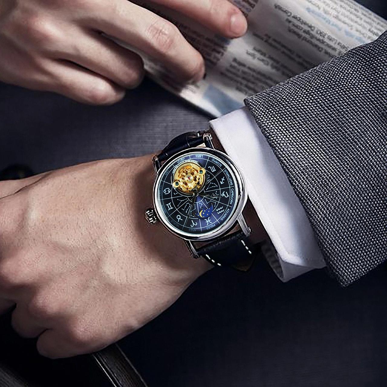 Découvrez la montre Andromède, un chef-d'œuvre d'horlogerie astrologique, conçue pour les passionnés des signes du zodiaque. Son cadran unique représente les 12 signes astrologiques, chacun accompagné de son nom, symbole, et constellation gravés avec une précision inégalée. Les détails phosphorescents illuminent doucement votre poignet dans l'obscurité, rappelant la lueur mystique des étoiles.